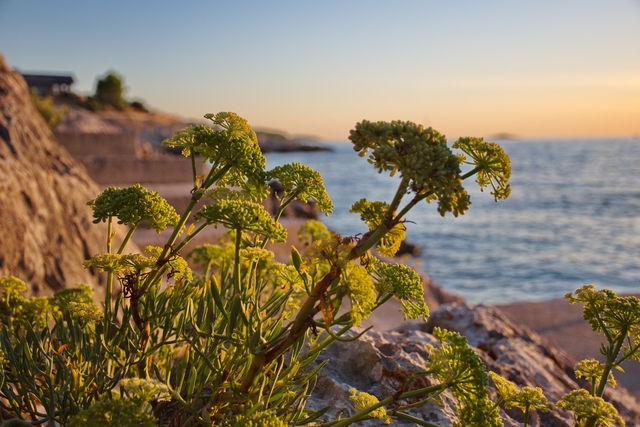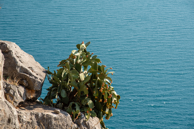 Accanto al lentisco prospera la salvia triloba (detta anche salvia greca), una pianta aromatica dalle grandi foglie vellutate che sprigionano un profumo caldo e intenso. Utilizzata nella medicina popolare e nella cucina tradizionale, la salvia è anche una delle specie più resistenti alla siccità, grazie alla sua straordinaria capacità di trattenere l’umidità nelle foglie. Ma Lampedusa sorprende anche per alcune presenze meno conosciute, come l’euforbia arborea (Euphorbia dendroides), pianta dalle forme scenografiche e dalla linfa lattiginosa che un tempo veniva usata come insetticida naturale. In primavera e in estate, le sue infiorescenze assumono un colore tra il verde acido e il giallo oro, creando contrasti cromatici sorprendenti con il blu del mare. Lungo le coste, dove la terra si fa sabbiosa e la salsedine impregna ogni cosa, compare il crithmum maritimum, o finocchio di mare, una pianta succulenta che cresce tra gli scogli, nota per le sue proprietà depurative e il suo uso gastronomico. Le sue foglie carnose venivano anticamente raccolte dai marinai per integrare la dieta con una fonte di vitamina C e contrastare lo scorbuto.